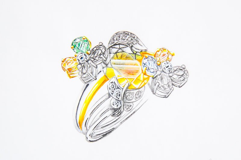 Le rush réalisé pendant le premier rendez-vous est ensuite transformé en un plan 3D en CAO (Conception Assistée par Ordinateur), permettant de visualiser les moindres détails de la création. Pour mieux appréhender le rendu final, une résine du bijou est réalisée.