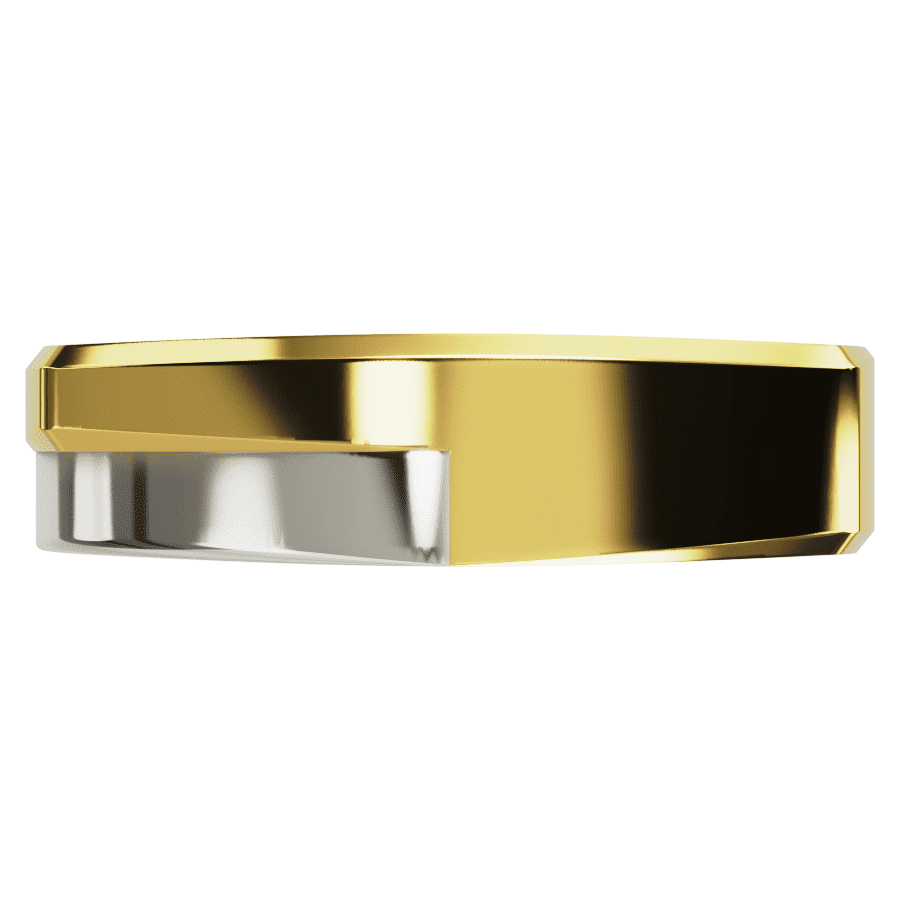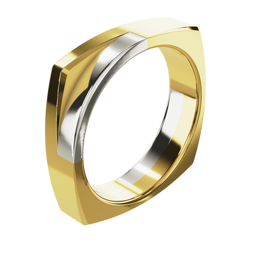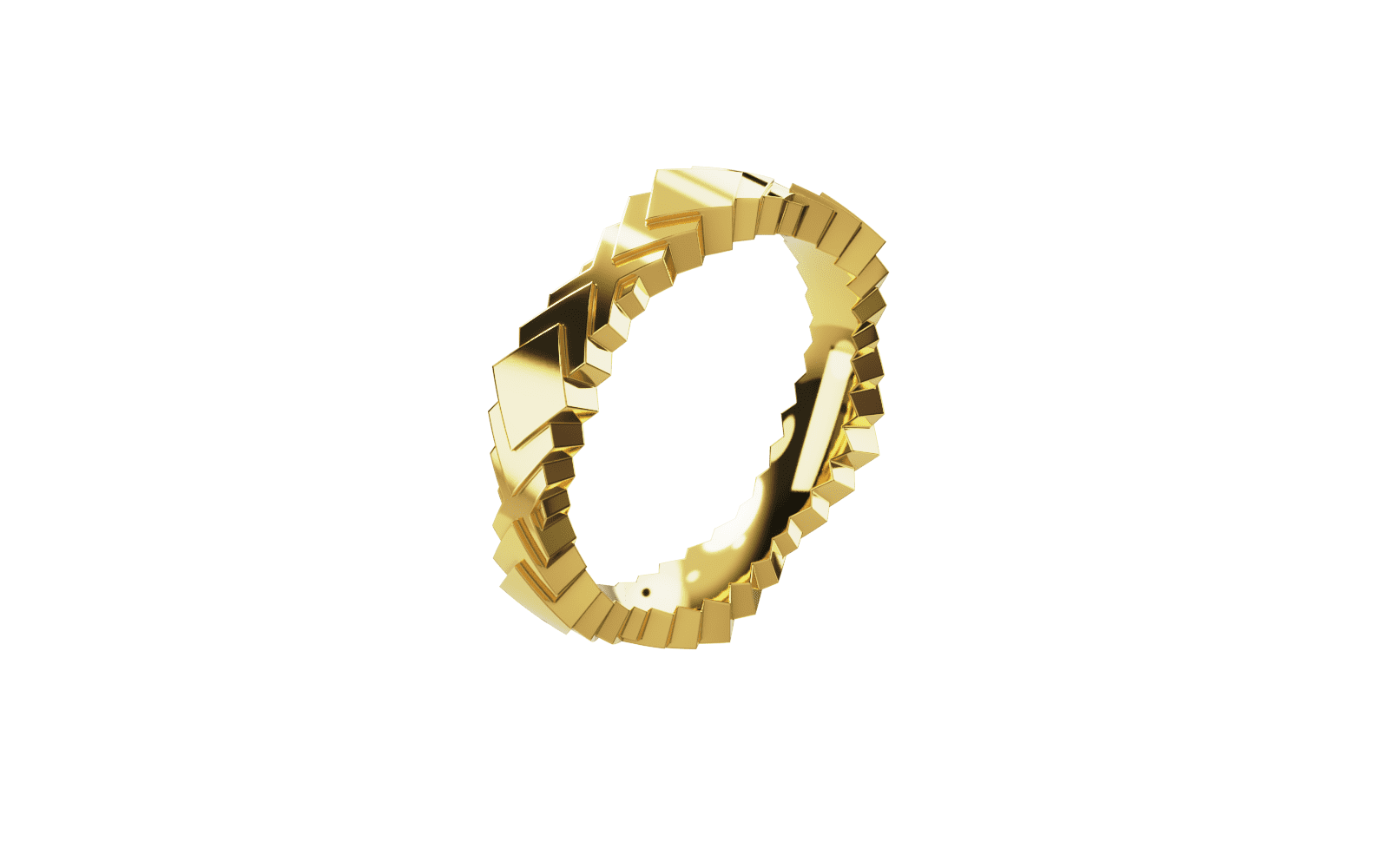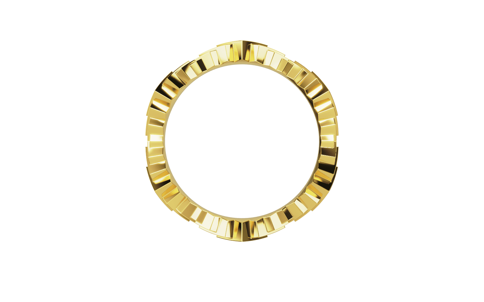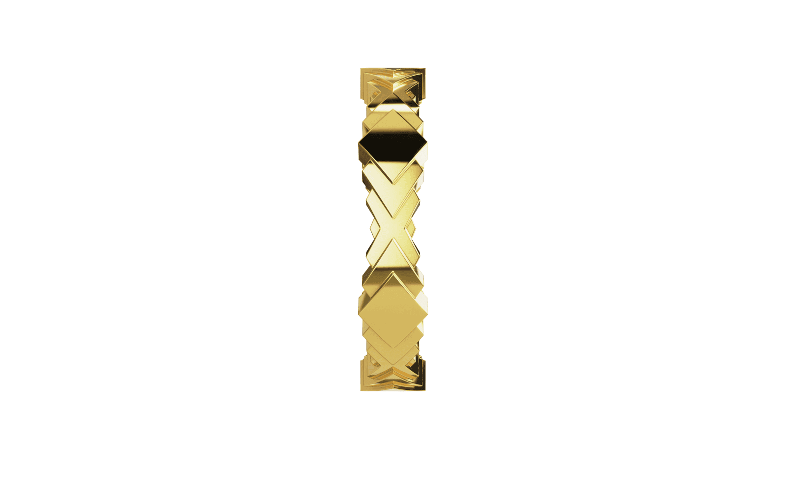 L’alliance Tesselle joue la carte de la géométrie maîtrisée. Son corps de bague est entièrement composé d’une alternance de petits carrés finement sculptés, créant un motif graphique, à la fois rythmé et délicat.
