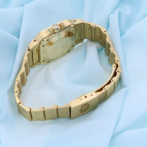 Cette Cartier Santos, modèle « Or Massif » en or jaune 750/1000, se distingue par son élégance précieuse. Sa lunette, sa couronne et son bracelet sont sertis de diamants, soulignant avec éclat son raffinement. Il s’agit de la version pour dame, aux dimensions harmonieuses de 24 x 35 mm. Elle est animée par un mouvement automatique Valjoux 2670, gage de fiabilité et de précision.