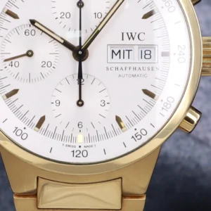 Certains modèles arborent également des cadrans originaux, comme les célèbres cadrans saumon, très en vogue à l’époque, qui témoignent de la capacité d’IWC à anticiper les tendances horlogères.