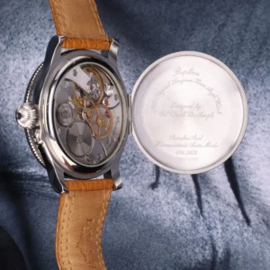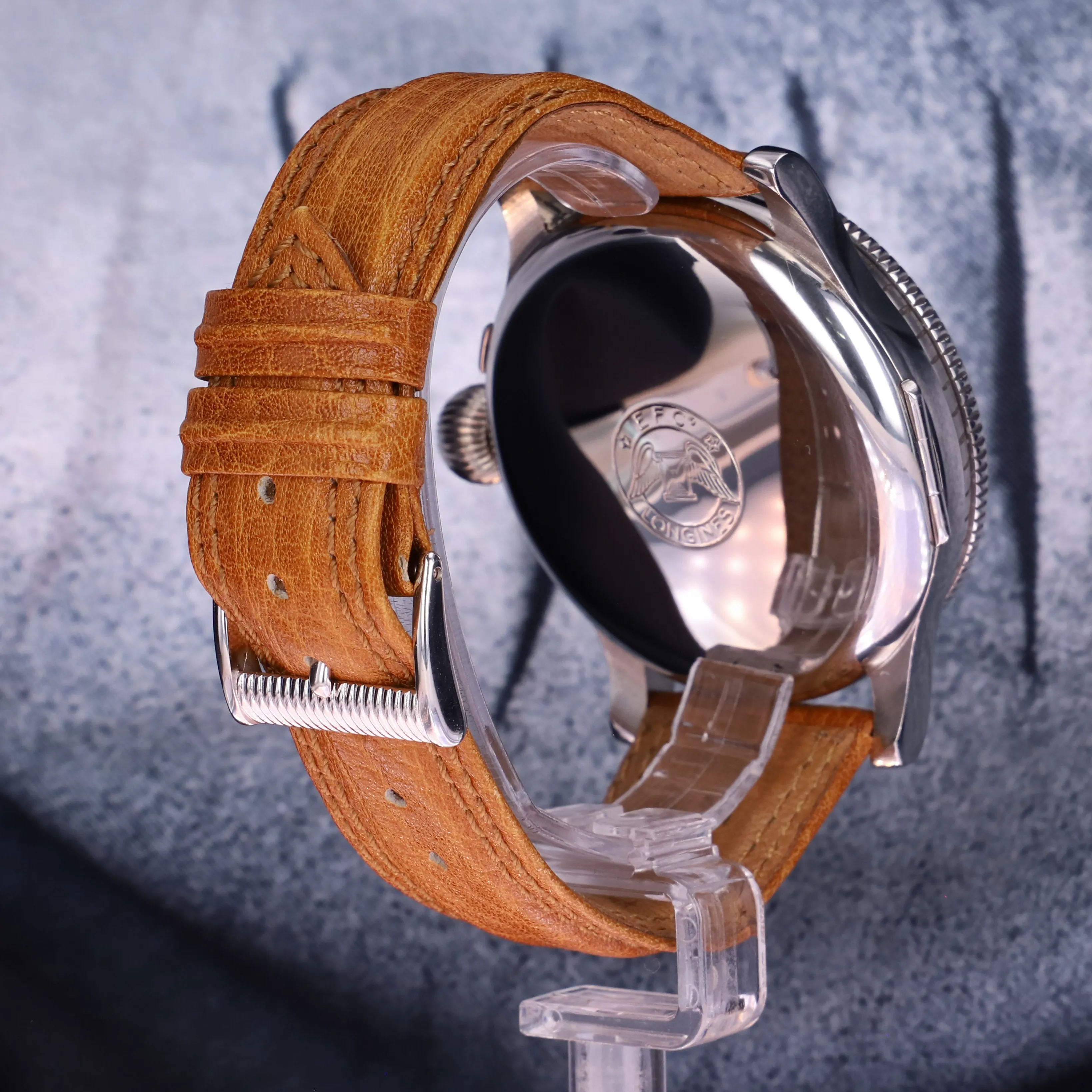 Surmontée d’une lunette tournante striée et gravée d’échelles de mesure, la montre affiche un cadran blanc lisible et fonctionnel. Celui-ci est structuré par un chemin de fer périphérique, des index en chiffres romains ainsi que des indications de mesure en chiffres arabes, rappelant les instruments de navigation de l’époque.