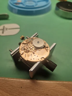 Contrairement à de nombreux mouvements de l’époque, le système de remontage automatique est ici entièrement intégré au mouvement, et non simplement ajouté à une base manuelle. Ce choix de conception permet un gain de compacité tout en offrant une structure plus robuste. L’entraînement indirect des minutes et des secondes libère en effet l’axe central, autorisant l’installation d’un roulement de rotor particulièrement solide, malgré un encombrement réduit.