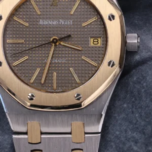 Il s’agit d’une Audemars Piguet Royal Oak, référence E – 3234, en or et acier. Ce modèle a été produit entre 1983 et 1986, et fut, pendant un certain temps, l’un des plus recherchés sur le marché gris.