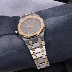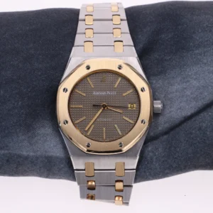 Il s’agit d’une Audemars Piguet Royal Oak, référence E – 3234, en or et acier. Ce modèle a été produit entre 1983 et 1986, et fut, pendant un certain temps, l’un des plus recherchés sur le marché gris.