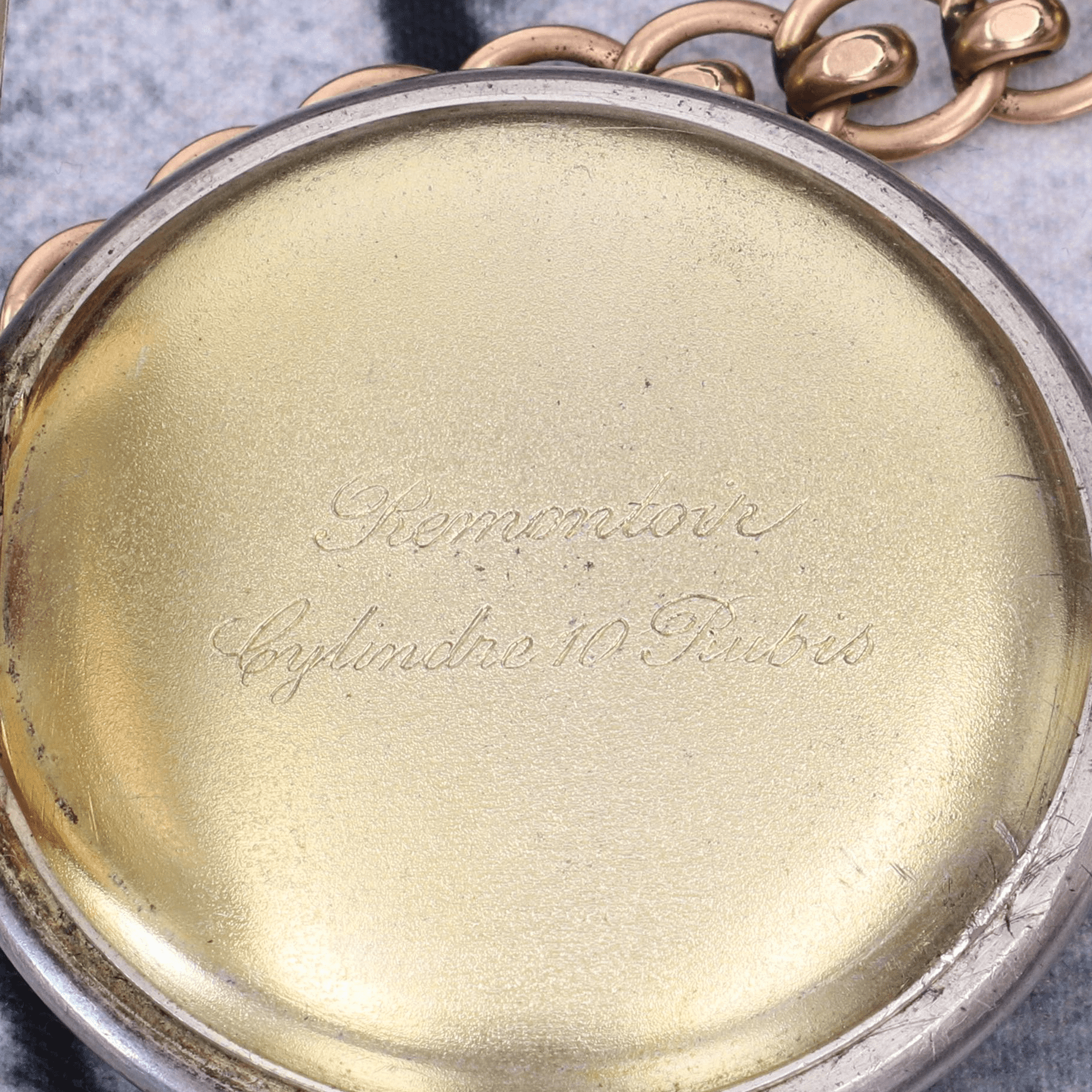 On remarque en outre la présence d'un poinçon représentant un lion couché, également gravé sur le mécanisme. Ce dernier est le poinçon de la manufacture Lion SA, un fabricant suisse actif entre le XIXᵉ et le XXᵉ siècle, établi dans le canton du Jura. Cela explique la présence d'inscriptions en français sur le double fond de la montre.